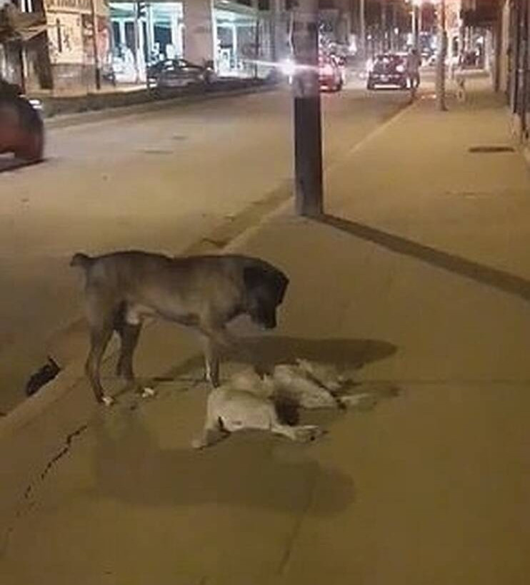 Το σκυλί που δεν χτυπήθηκε προσπαθεί σαν να είναι άνθρωπος να επαναφέρει στη ζωή τον φίλο του. Η προσπάθεια του όμως είναι καταδικασμένη. Πηγή: Daily Mail