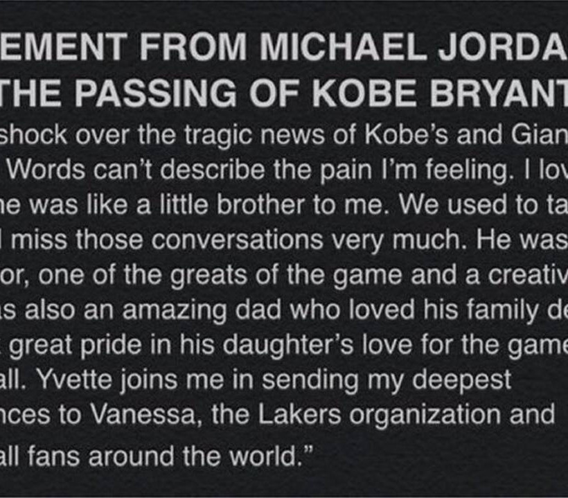Ο Μάικλ Τζόρνταν στο άκουσμα της είδησης του θανάτου του Κόμπι Μπράιαντ, δήλωσε συγκλονισμένος και τόνισε πως δεν υπάρχουν λόγια για να περιγράψει τον πόνο που νιώθει μετά το θλιβερό συμβάν.