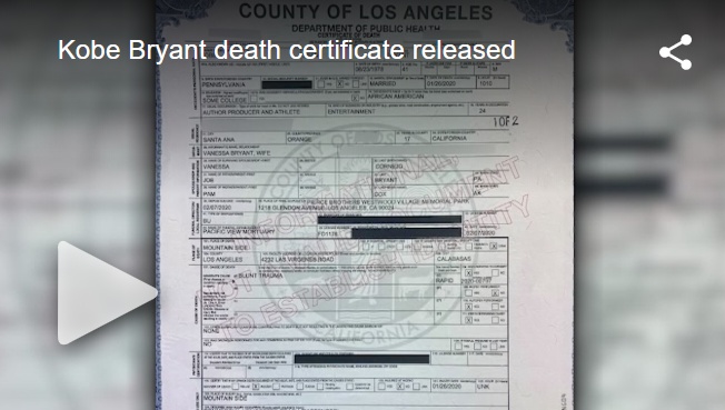 Την ίδια ώρα το FOX 11 έφερε στη δημοσιότητα το πιστοποιητικό θάνατου του Κόμπι Μπράιαντ μετά το αεροπορικό δυστύχημα στο οποίο έχασε τη ζωή του μαζί με άλλους οχτώ ανθρώπους.