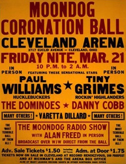 Η συναυλία ορίστηκε για το βράδυ της Παρασκευής 21 Μαρτίου 1952. Ονομάστηκε «Moondog Coronation Ball» και θα εμφανίζονταν γνωστά ονόματα της ριθμ εντ μπλουζ σκηνής, όπως οι Πολ «Χακλμπακκ» Γουίλιαμς, Τίνυ Γκράιμς, Δε Ντόμινος, Ντάνι Κομπ και Βαρέτα Ντίλαρντ. Η διοργάνωση της συναυλίας ήταν υποτυπώδης. Ο Φριντ εξέδωσε αρχικά 7.000 εισιτήρια προς 1,5 δολάριο έκαστο και αφού είδε τη μεγάλη απήχηση που είχε το γεγονός στη νεολαία της πόλης άρχισε να διαθέτει και νέα πακέτα εισιτηρίων.