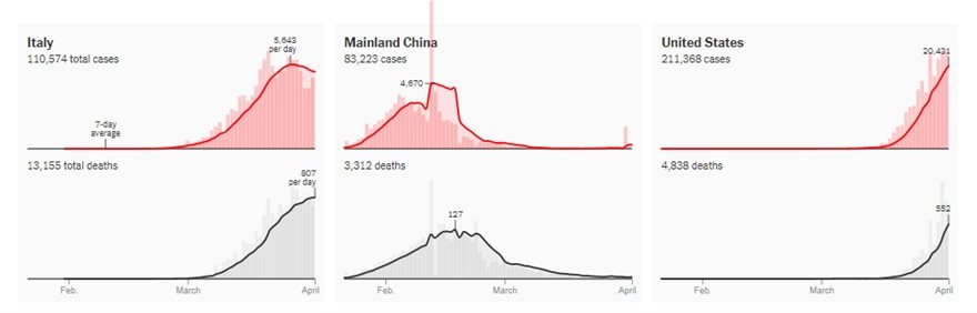 Κορονοϊός | Ειδήσεις: Οι New York Times έδωσαν στη δημοσιότητα τα γραφήματα των κρουσμάτων και των θυμάτων σε 126 χώρες ούτως ώστε να υπάρξει κάποια εικόνα για το εάν υπάρχει υποχώρηση της πανδημίας.