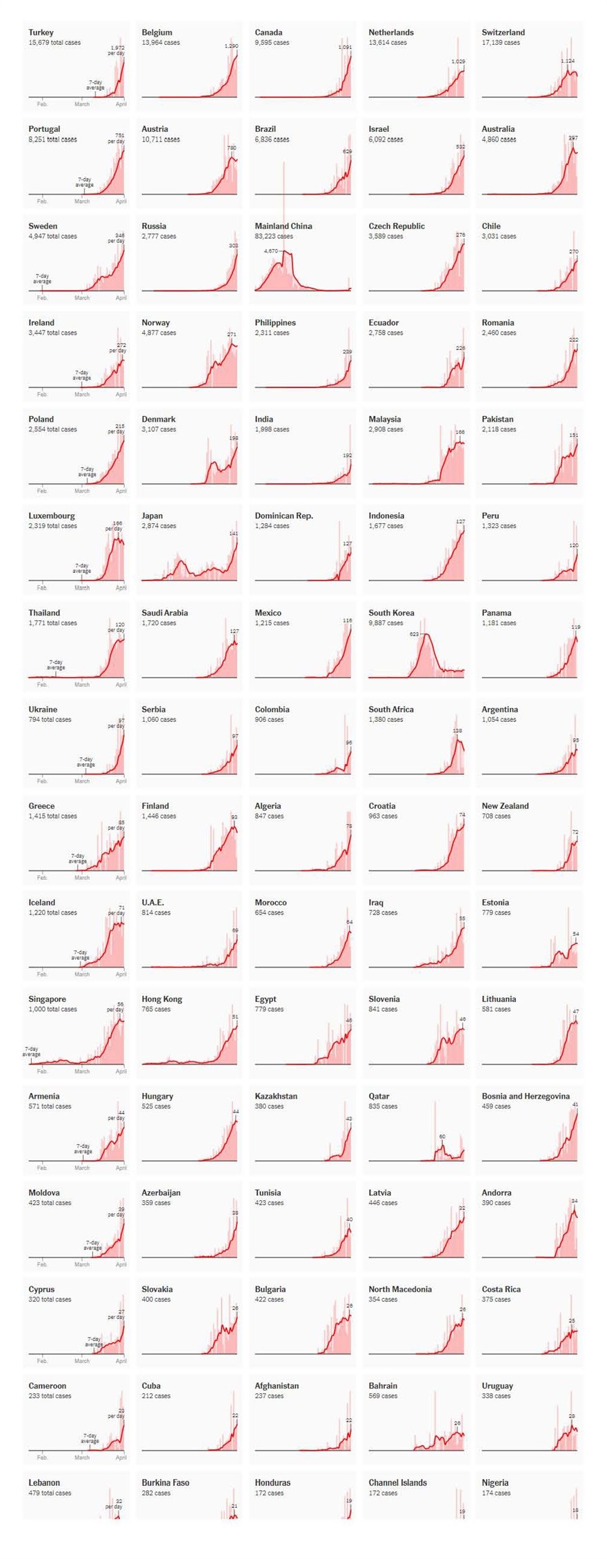 Οι New York Times επιχείρησαν να χαρτογραφήσουν, τις καμπύλες των κρουσμάτων σε συνολικά 126 χώρες - ανάμεσά τους και η Ελλάδα - με στοιχεία που καταγράφηκαν έως τις 3 Απριλίου.