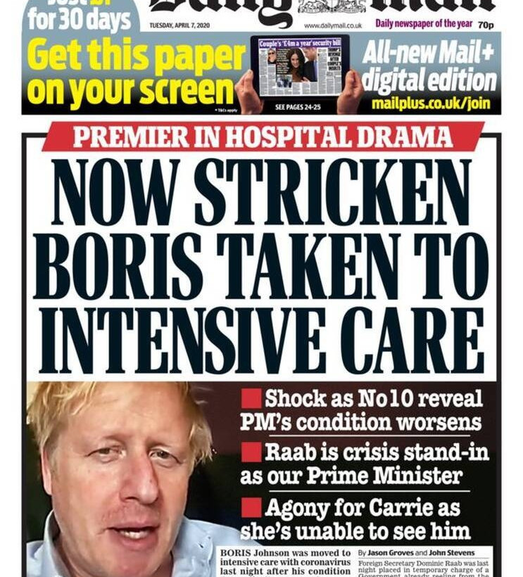 Η εισαγωγή του πρωθυπουργού της Βρετανίας, Μπόρις Τζόνσον, σε Μονάδα Εντατικής Θεραπείας, μονοπωλεί τα πρωτοσέλιδα του Τύπου.