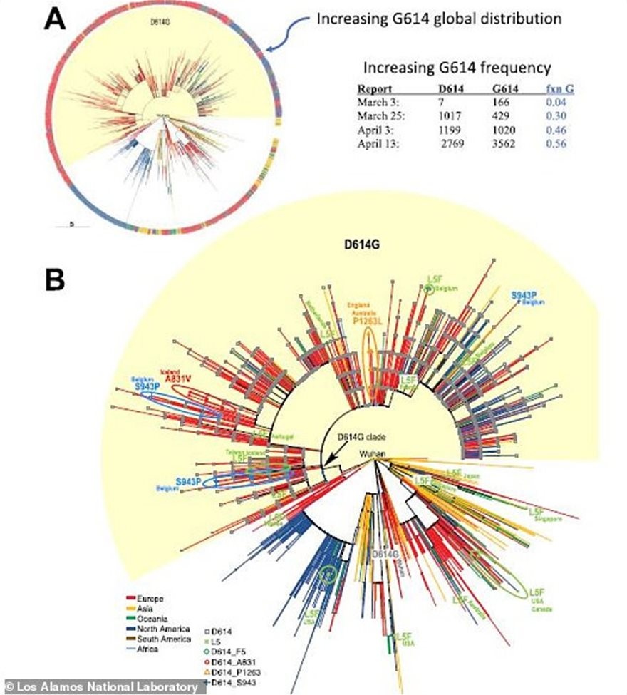 Δεν είναι, όμως, σαφές εάν η εν λόγω μετάλλαξη εμφανίστηκε για πρώτη φορά στην Κίνα ή την Ευρώπη, αλλά σίγουρα συγκεντρώθηκε σε μεγάλο βαθμό στην Ευρώπη και, στη συνέχεια, «σάρωσε» τον κόσμο.