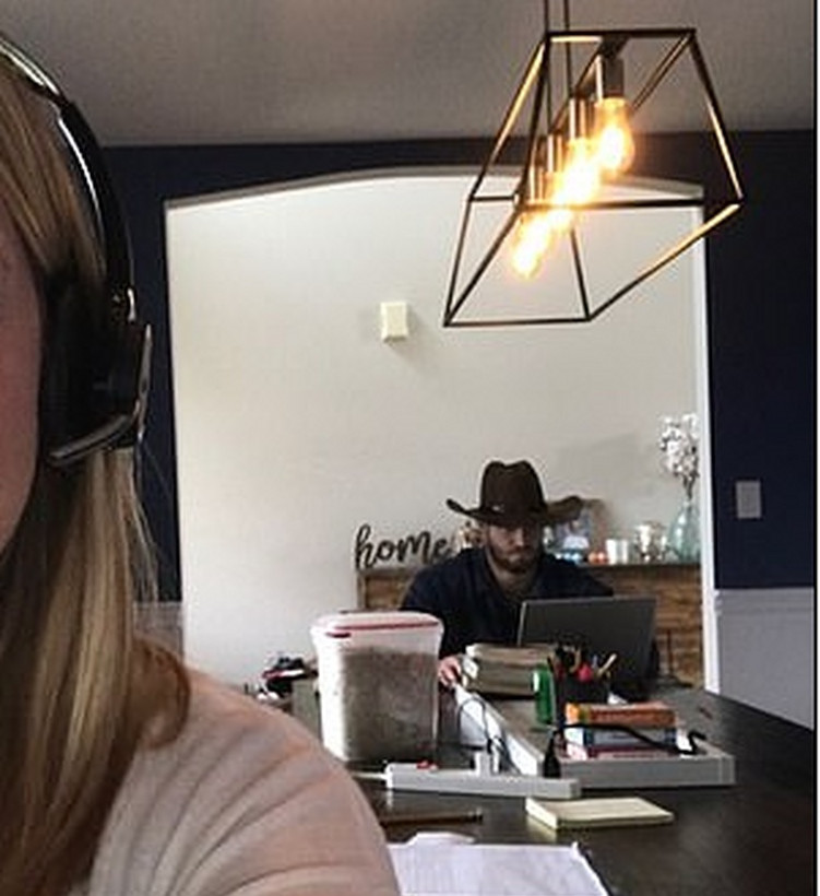 Σύμφωνα με όσα μεταδίδει η Daily Mail στη διάρκεια των τηλεδιασκέψεών της στο Zoom, εκείνος κάνει photo bombing: εμφανίζεται στο βάθος με διάφορες αστείες μεταμφιέσεις, για παράδειγμα, ντυμένος Μπάτμαν ή καουμπόι κ.α.