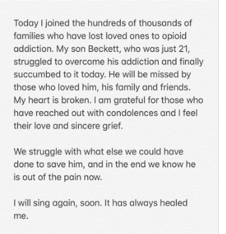 "Σήμερα έγινα μία από τις εκατοντάδες χιλιάδες οικογένειες που έχασαν τους αγαπημένους τους λόγω εθισμού στα οπιοειδή. Ο γιος μου, Beckett, ο οποίος ήταν μόλις 21 ετών, προσπαθούσε να ξεπεράσει τον εθισμό του και τελικά υπέκυψε σε αυτόν σήμερα. Θα λείψει σε όσους τον αγαπούσαν, στην οικογένεια και στους φίλους του. Παλεύουμε με τη σκέψη για το τι άλλο θα μπορούσαμε να κάνουμε για να τον σώσουμε, τουλάχιστον ξέρουμε ότι τώρα δεν πονάει πια".