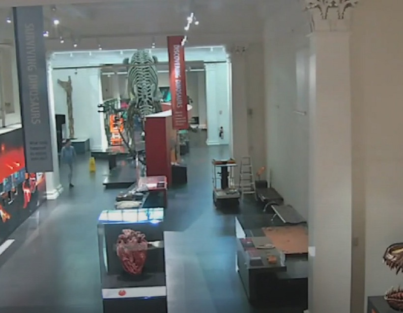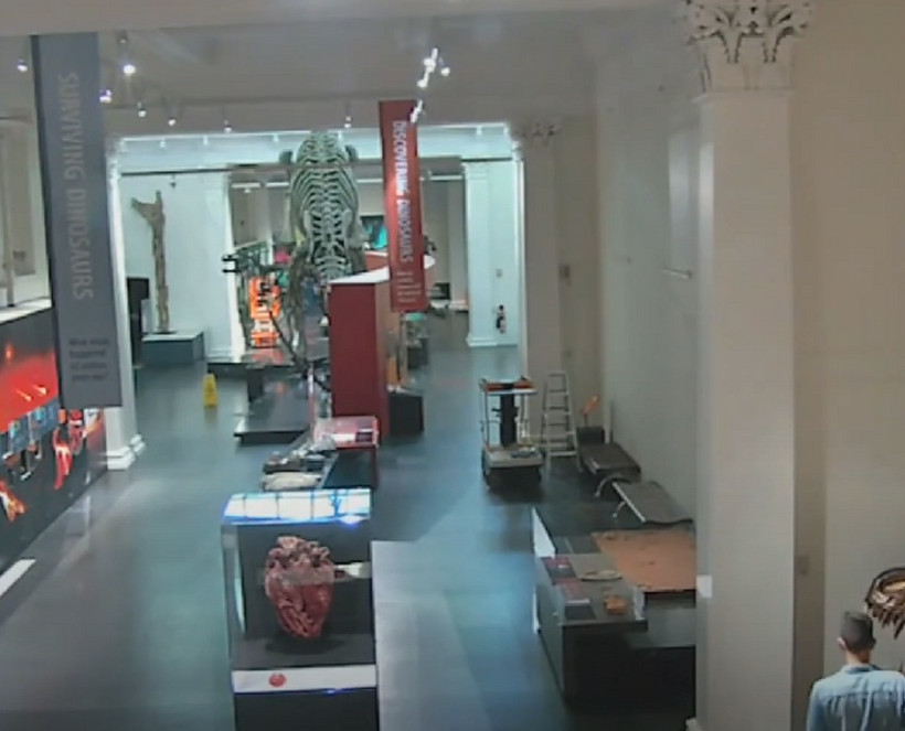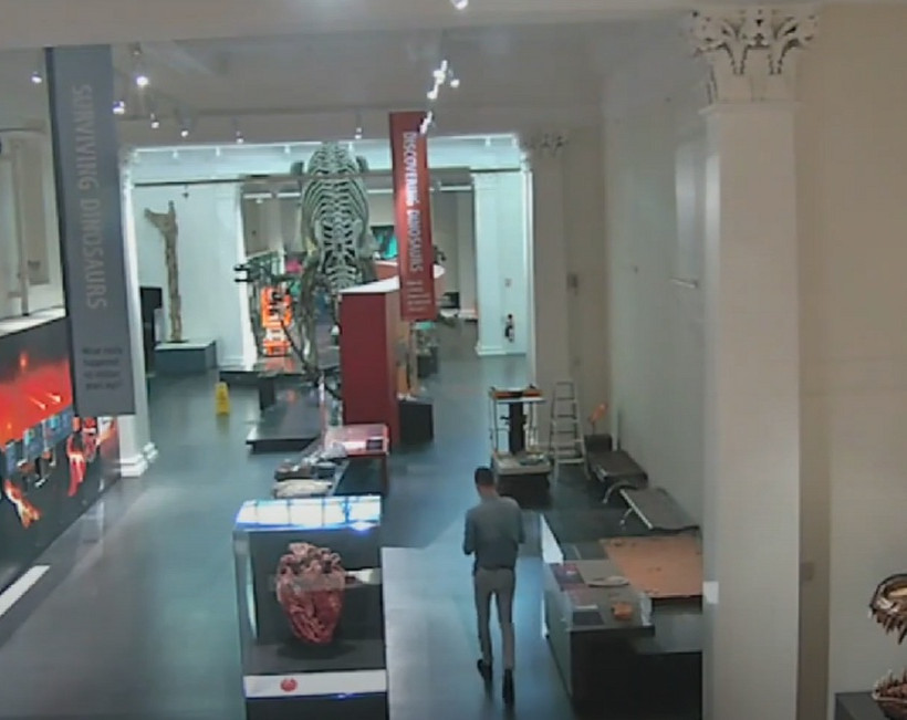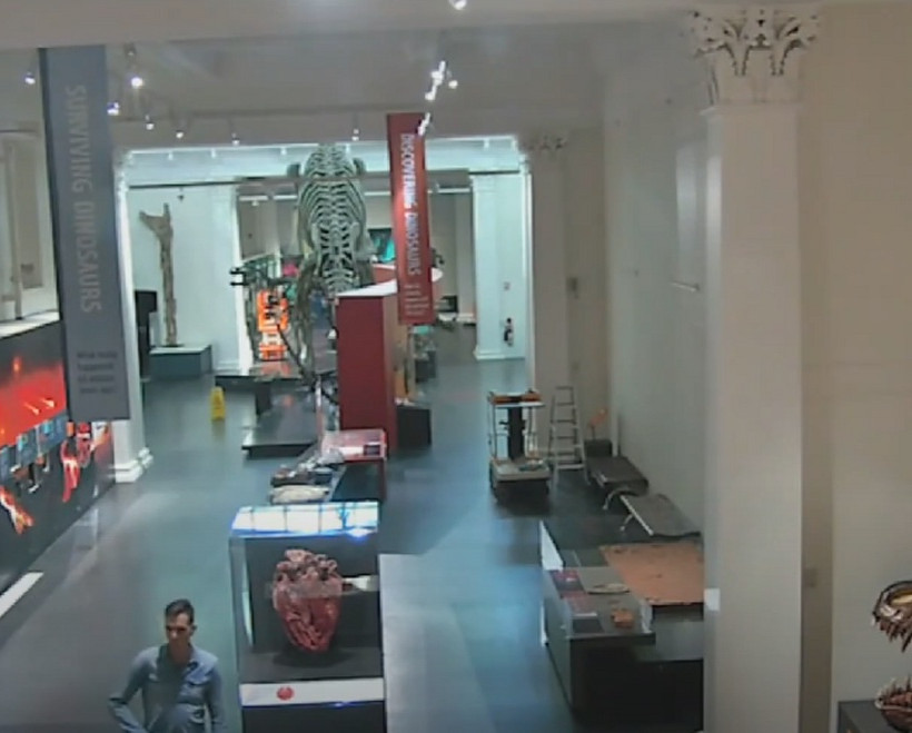 Οι κάμερες ασφαλείας κατέγραψαν τον άντρα να τραβάει φωτογραφίες με τα εκθέματα και να ψάχνει στις προθήκες.