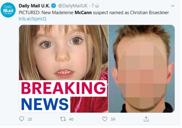 Υπενθυμίζεται ότι η εξαφάνιση της Μαντλίν έχει έρθει και πάλι στο επίκεντρο, καθώς χθες, Τετάρτη, η βρετανική και γερμανική Αστυνομία έκαναν έκκληση για πληροφορίες σχετικά με Γερμανό παιδόφιλο που βρίσκεται πλέον σε φυλακή της γενέτειράς του και ο οποίος ήταν 30 ετών όταν εξαφανίστηκε η μικρή Βρετανίδα.