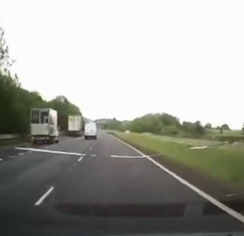 Άγιο είχε... Τρομακτικές στιγμές έζησε ένας οδηγός στην Ουαλία όταν μια σανίδα ξέφυγε από προπορευόμενο όχημα και χτύπησε στο παρμπρίζ του αμαξιού του με αποτέλεσμα να σπάσει
