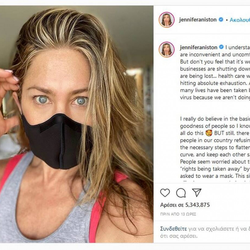Ανάμεσα σε αυτές τις φωνές είναι και αυτή της Τζένιφερ Άνιστον, η οποία ξεσπά εναντίον εκείνων που δεν δέχονται να φορέσουν μάσκα σε δημόσιους χώρους και δεν κάνουν όσα πρέπει προκειμένου να επιπεδώσουν την καμπύλη.