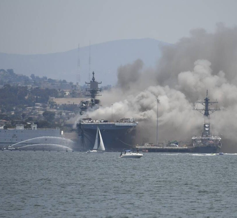 Αμερικανικά τηλεοπτικά δίκτυα μετέδωσαν πλάνα στα οποία εικονίζεται πυκνός γκρίζος καπνός να υψώνεται από το USS Bonhomme Richard, δεμένο στην αποβάθρα της βάσης του στο Σαν Ντιέγκο για συντήρηση.