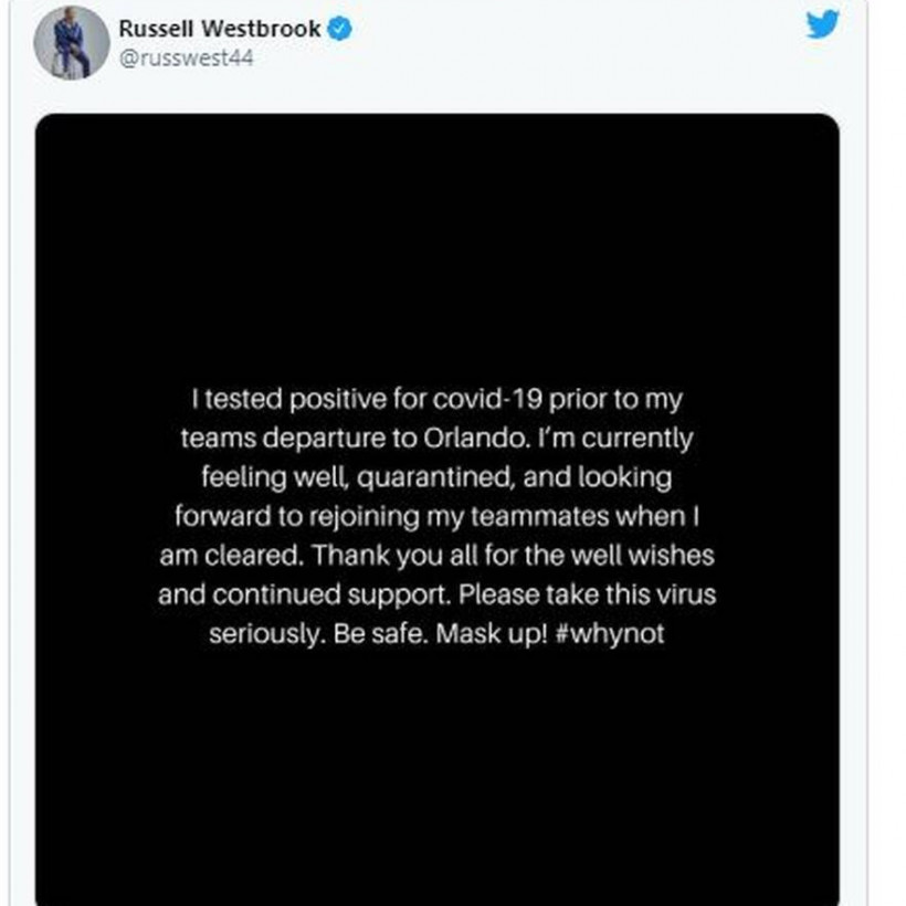 “Βρέθηκα θετικός στον covid-19 πριν η ομάδα αναχωρήσει για το Ορλάντο. Νιώθω καλά, είμαι σε καραντίνα και ανυπομονώ να βρεθώ και πάλι με τους συμπαίκτες μου. Ευχαριστώ όλους σας για τις ευχές και την υποστήριξή σας. Παρακαλώ πάρτε τον ιό στα σοβαρά. Μείνετε ασφαλείς”, αναφέρει χαρακτηριστικά ο Γουέστμπρουκ.