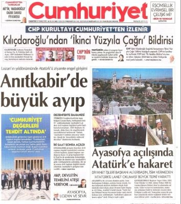 Ωστόσο, η cumhuriyet, στο πρωτοσέλιδό αναφέρει ότι όσα ακούστηκαν στην Αγιά Σοφιά την Παρασκευή αποτέλεσαν «προσβολή» προς τον Κεμάλ.