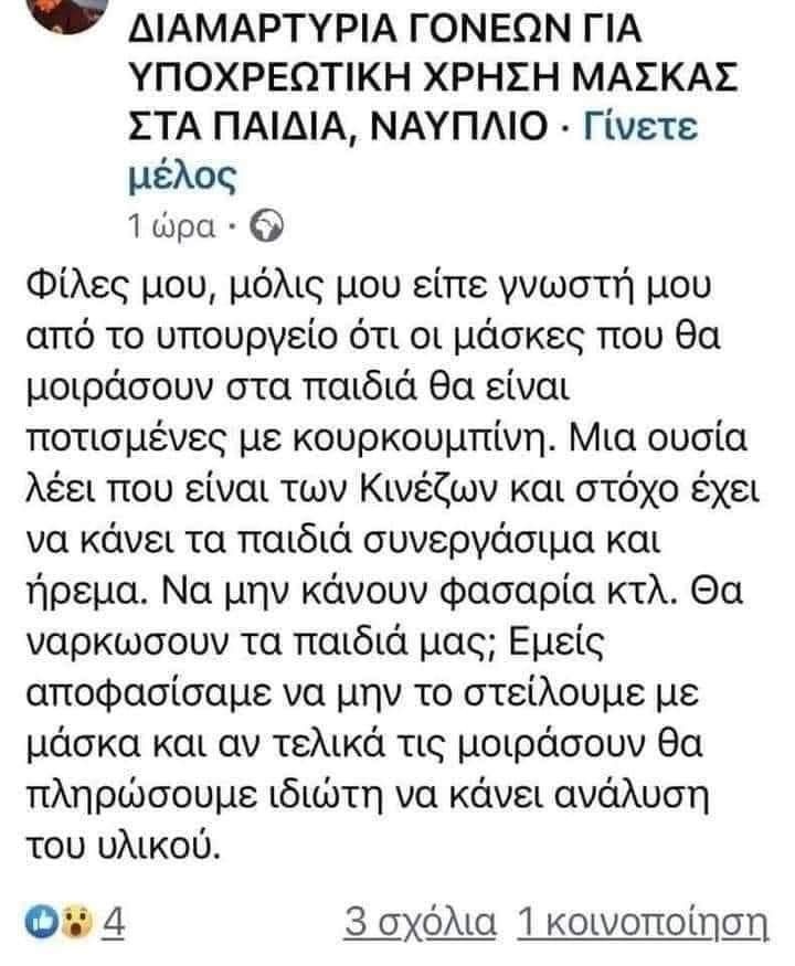 «Φίλες μου, μόλις μου είπε γνωστή μου από το υπουργείο ότι οι μάσκες που θα μοιράσουν στα παιδιά θα είναι ποτισμένες με κουρκουμπίνη. Μια ουσία λέει που είναι των κινέζων και στόχο έχει να κάνει τα παιδιά συνεργάσιμα και ήρεμα. Να μην κάνουν φασαρία κτλ.