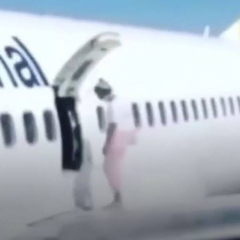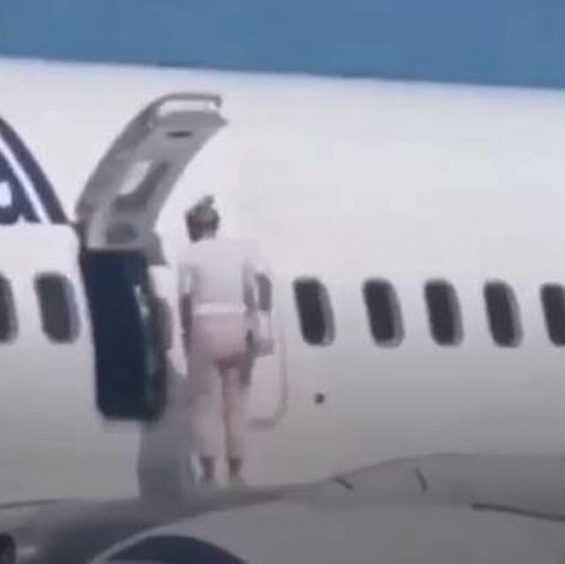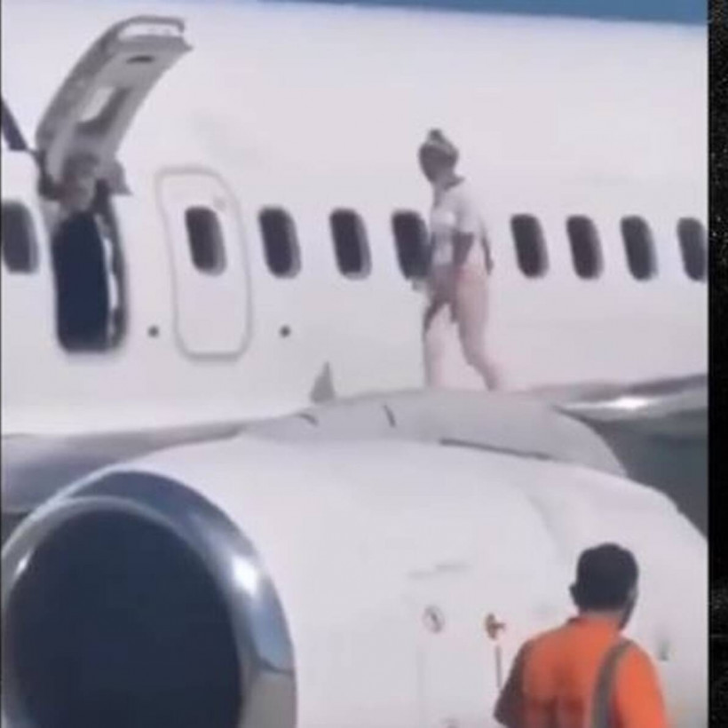 Σε βίντεο που κατέγραψαν οι εργαζόμενοι στο αεροδρόμιο, η γυναίκα κυριολεκτικά βγαίνει από την έξοδο και αρχίζει να κάνει μια μικρή βόλτα κατά μήκος του φτερού του αεροπλάνου.