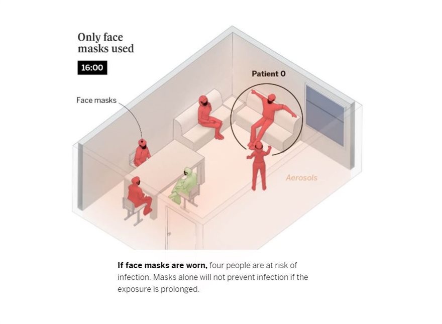 Έπειτα από τέσσερις ώρες, αν κανένας δεν φορά μάσκα και δεν υπάρχει αερισμός του χώρου, θα νοσήσουν και οι πέντε υγιείς του δωματίου.