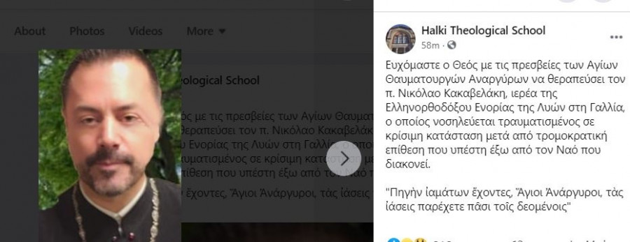 «Ευχόμαστε ο Θεός με τις πρεσβείες των Αγίων Θαυματουργών Αναργύρων να θεραπεύσει τον π. Νικόλαο Κακαβελάκη, ιερέα της Ελληνορθοδόξου Ενορίας της Λυών στη Γαλλία, ο οποίος νοσηλεύεται τραυματισμένος σε κρίσιμη κατάσταση μετά από τρομοκρατική επίθεση που υπέστη έξω από τον Ναό που διακονεί.”Πηγὴν ἰαμάτων ἔχοντες, Ἅγιοι Ἀνάργυροι, τὰς ἰάσεις παρέχετε πᾶσι τοῖς δεομένοις»