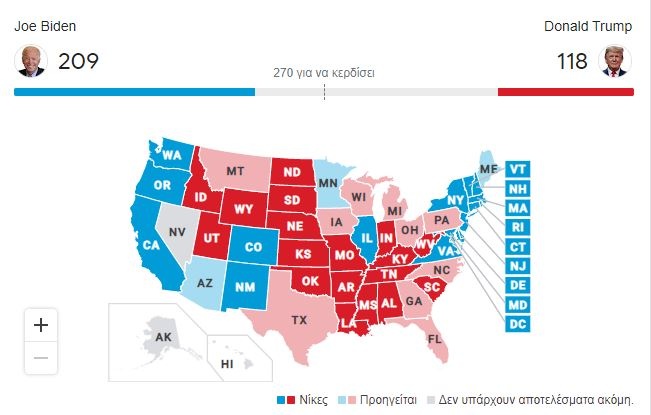 Έως και αυτή την ώρα, ο Τζο Μπάιντεν προηγείται έχοντας συγκεντρώσει 209 εκλέκτορες, έναντι 118 του Ντόναλντ Τραμπ. Το αποτέλεσμα είναι εντελώς αμφίρροπο, καθώς συνεχώς προστίθενται τα αποτελέσματα από πολιτείες όπου κλείνουν οι κάλπες.