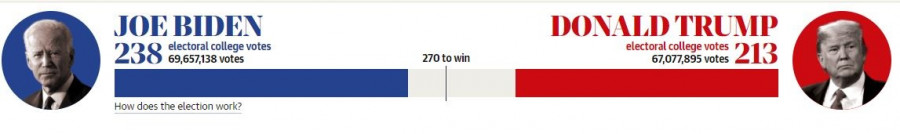 Ο Τζο Μπάιντεν έχει εξασφαλίσει μέχρι στιγμής 238 εκλέκτορες, έναντι 213 του Ντόναλντ Τραμπ. Σύμφωνα με αμερικανικά ΜΜΕ, η «κούρσα» μεταξύ του Τραμπ και Μπάιντεν βρίσκεται στην κόψη του ξυραφιού, χωρίς ξεκάθαρο νικητή ενόσω συνεχίζει η μέτρηση των ψήφων και ίσως να χρειαστούν μέρες για να υπάρξει καθαρός νικητής.