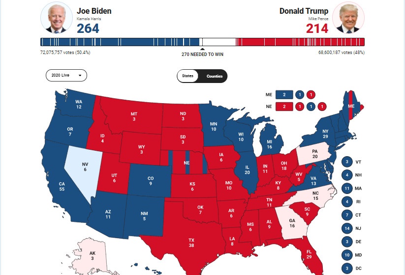 Στον χάρτη λοιπόν βλέπουμε πως ο Τζο Μπάιντεν ο οποίος έχει εξασφαλίσει 264 εκλέκτορες μετά και την νίκη του σε Ουισκόνσιν και Μίσιγκαν που ήλθε μάλιστα από ανατροπή, οι τέσσερις πολιτείες που αναμένεται το αποτέλεσμα είναι η Πενσυλβάνια, η Τζώρτζια η Βόρεια Καρολίνα, η Αλάσκα και η Νεβάδα.