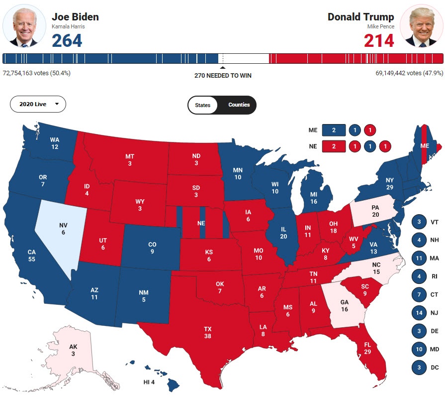 Ο Τζο Μπάιντεν έχει εξασφαλίσει 264 εκλέκτορες ενώ ο Ρεπουμπλικάνος Ντόναλντ Τραμπ 214.