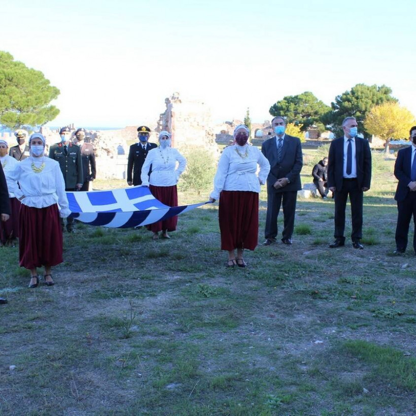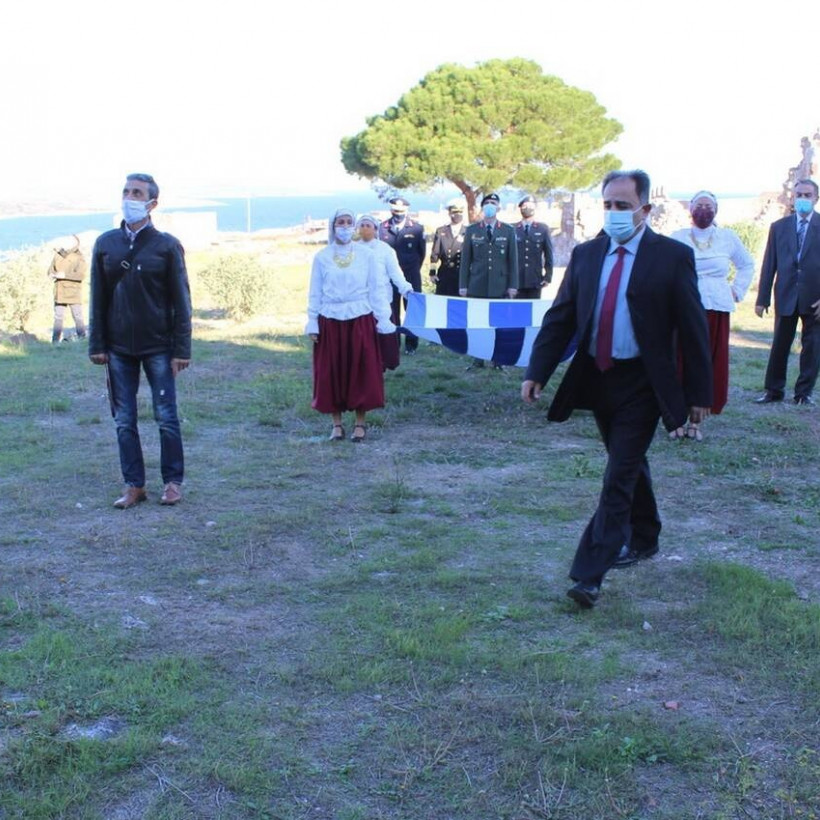 Το πρωί της Κυριακής, ο δήμαρχος Μυτιλήνης Στρατής Κύτελης, συνοδευόμενος από τους ελάχιστους δυνατούς εκπροσώπους των τοπικών αρχών μετέφεραν τη σημαία της πόλης από το ιστορικό δημαρχείο στη Μυτιληνιά προκυμαία, στο κάστρο.
