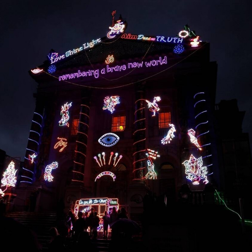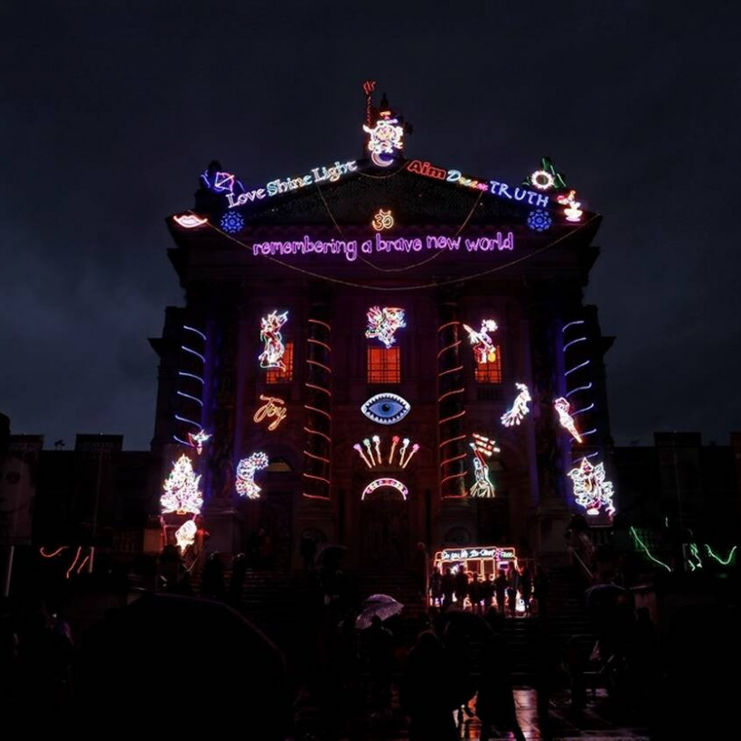 Στο «Remembering a Brave New World», τεχνικολόρ σύμβολα, αναφορές στην ποπ κουλτούρα και θρησκευτική εικονογραφία μετατρέπουν το νεοκλασικό κτίσμα σε έναν φωτεινό εορτασμό του Diwali, του πενθήμερου ινδικού φεστιβάλ φωτός που λήγει σήμερα.