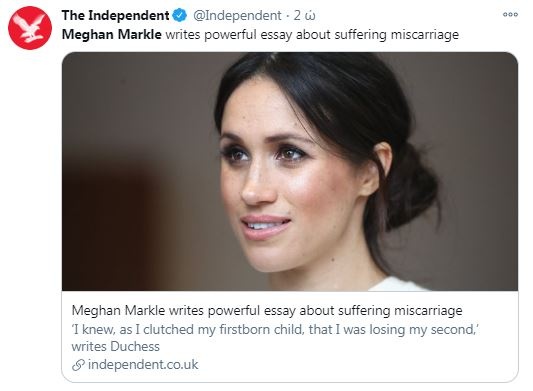 Η Μέγκαν Μαρκλ, σε άρθρο της με τίτλο «Οι απώλειες που μοιραζόμαστε», αποκάλυψε ότι υπέστη αποβολή κατά τη διάρκεια του καλοκαιριού -στο νέο της σπίτι στην Καλιφόρνια- και είχε ότι έχασε το δεύτερο παιδί της αφού ένιωσε «μια έντονη κράμπα» την ώρα που άλλαζε πάνα στον γιο της Άρτσι.