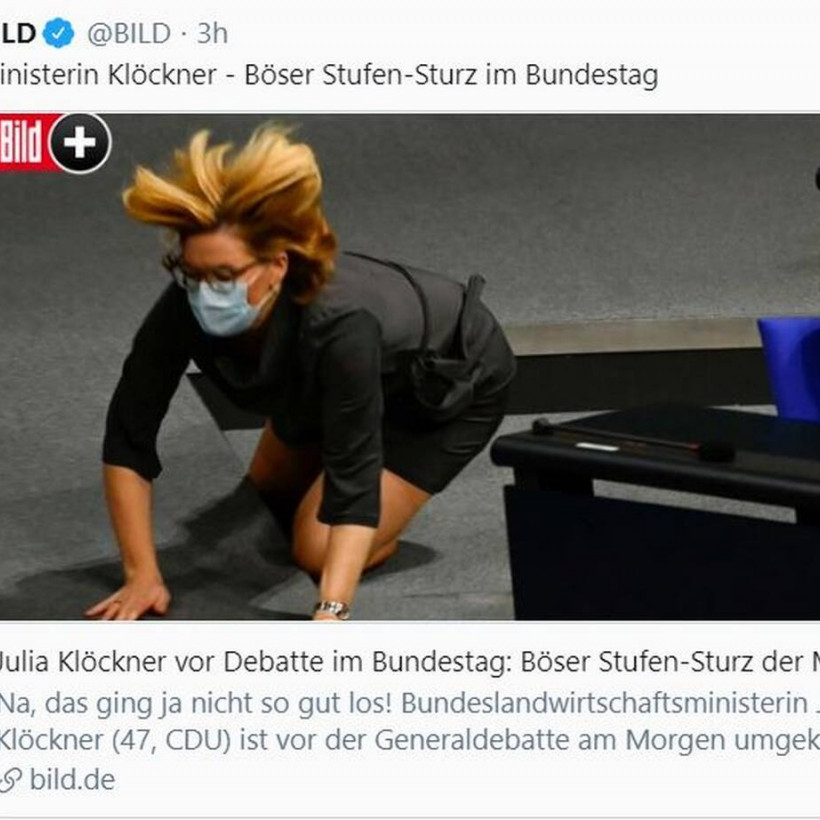 Ένα απρόοπτο είχε η Γερμανίδα υπουργός Αγροτικής Ανάπτυξης, Γιούλια Κλόκνερ, η οποία σκόνταψε και έπεσε την ώρα της συνεδρίασης στην ομοσπονδιακή Βουλή της Γερμανίας.