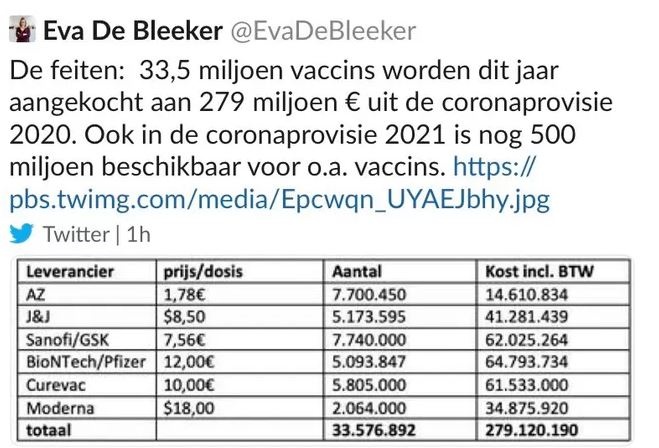 Σύμφωνα με το HLN που κράτησε το tweet του υφυπουργού Προϋπολογισμού η Ε.Ε. οι δαπάνες για τα εμβόλια είναι οι εξής: