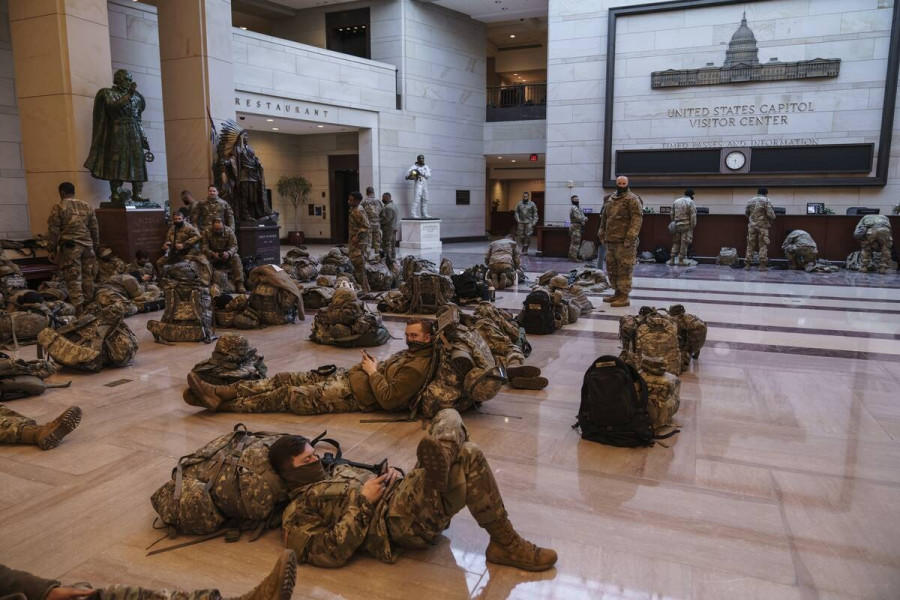 Οι εικόνες αυτές από την Ουάσιγκτον έρχονται την ώρα που έχει ξεκινήσει ξεκινήσει η διαδικασία από την Βουλή των Αντιπροσώπων για την αποπομπή του Ντόναλντ Τραμπ, καθώς υπάρχουν φόβοι για ένοπλες επιθέσεις. Για τον λόγο αυτό η εθνοφυλακή βρίσκεται σε ύψιστη επιφυλακή με αποτέλεσμα δεκάδες οι πάνοπλοι στρατιώτες να βρίσκονται αμετακίνητοι μέσα στο Καπιτώλειο και μάλιστα να κάθονται στο πάτωμα για να ξεκουραστούν.