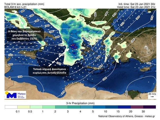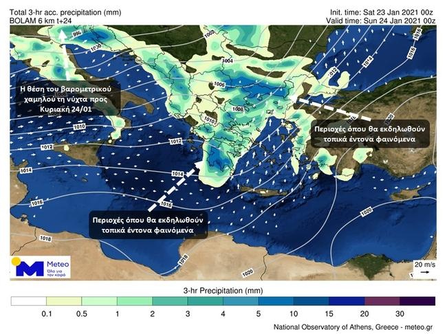 - Από τις απογευματινές ώρες της Κυριακής (24-01-2021) στα νησιά του Ιονίου, την Ήπειρο, τη δυτική Στερεά και πιθανώς πρόσκαιρα αργά το βράδυ στη δυτική Πελοπόννησο, με εξασθένηση από τις πρώτες πρωινές ώρες της Δευτέρας (25-01-2021).