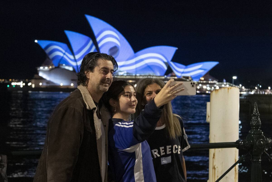 Λίγο μετά τη δύση του ηλίου, άρχισε η αντίστροφη μέτρηση για την φωταγώγηση του φημισμένου κτιρίου. Το λιμάνι της αυστραλιανής μεγαλούπολης πλημμύρισε με Έλληνες ομογενείς που κρατούσαν ελληνικές σημαίες, έψαλλαν τον εθνικό ύμνο και φωτογράφισαν την ιστορική στιγμή.