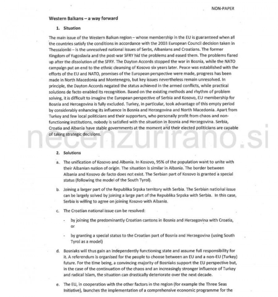 Η ενημερωτική ιστοσελίδα της Σλοβενίας δημοσίευσε τμήματα αυτού του παράξενου non paper, όπου κάνει λόγο για επαναπροσδιορισμό των συνόρων στην περιοχή για να επιλυθούν μακροχρόνια προβλήματα στη Βοσνία-Ερζεγοβίνη και το Κόσοβο.