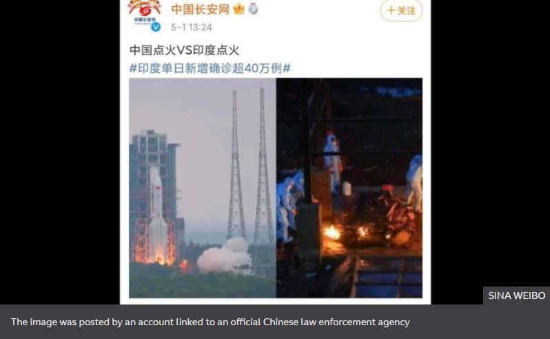 Η επίμαχη ανάρτηση δημοσιεύτηκε το απόγευμα του Σαββάτου στην κοινωνική πλατφόρμα Weibo και πλέον έχει διαγραφεί. Σύμφωνα με το BBC, έδειχνε μία φωτογραφία από εκτόξευση κινεζικού πυραύλου και δίπλα σε αυτήν μια εικόνα από θύματα του κορονοϊού να αποτεφρώνονται στην Ινδία.
