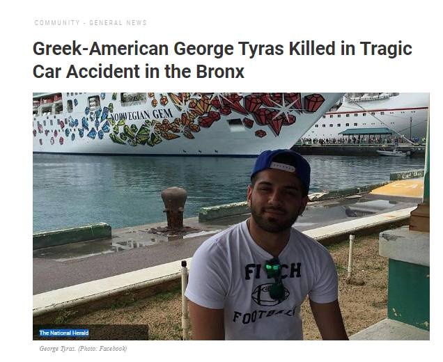 Τραγικό θάνατο βρήκε, τις πρώτες πρωινές της Παρασκευής, σε τροχαίο δυστύχημα στο Μπρονξ της Νέας Υόρκης, ο Ελληνοαμερικανός Τζορτζ Τίρας, γιος του γνωστού επιχειρηματία Μάικ Τίρα.