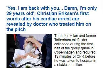 «Εκείνη την στιγμή, σιγουρεύτηκα ότι ο εγκέφαλός του δεν είχε υποστεί βλάβη και ότι είχε επιστρέψει εντελώς», συνέχισε ο γιατρός, επισημαίνοντας ότι ο Έρικσεν απάντησε σε όλες τις ερωτήσεις που του τέθηκαν. Αλλά χρειάστηκε πολύς χρόνος για να εγκατασταθεί ο απαραίτητος ιατρικός εξοπλισμός, προκειμένου να διακομισθεί στο νοσοκομείο».