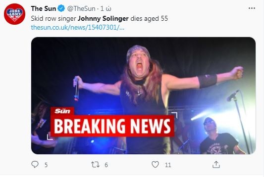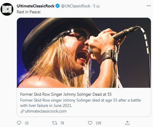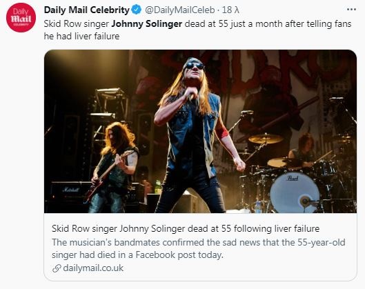 Πέθανε σε ηλικία 55 ετών ο τραγουδιστής των Skid Row, Johnny Solinger, λόγω ηπατικής ανεπάρκειας