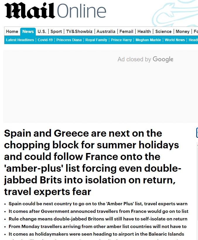 Ο Πολ Τσαρλς, επικεφαλής της συμβουλευτικής εταιρίας PC Agency, δήλωσε στην εφημερίδα Daily Mail ότι «είναι πολύ πιθανό η κυβέρνηση να προσθέσει και την Ισπανία και την Ελλάδα στην «πορτοκαλί+» λίστα που απαιτεί καραντίνα και για τους εμβολιασμένους στην επιστροφή.