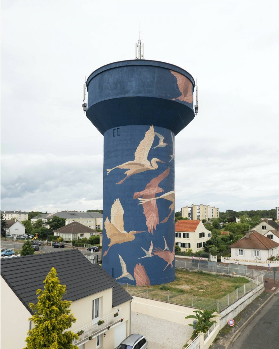 Ένας ύψους 35 μέτρων υδατόπυργος που «επιθεωρεί» από ψηλά την πόλη Gien της Γαλλίας είναι ο καμβάς για τη νέα τοιχογραφία του καλλιτέχνη δρόμου Taquen, η οποία υμνεί τη ζωοδότρα δύναμη του νερού. Στο έργο που ακούει στο όνομα «Eau de Loire (Νερό του Λίγηρα)», σε βαθύ μπλε φόντο, ένα σμήνος από ψαραετούς, ερωδιούς και γλαρόνια πετούν σε κύκλο γύρω από τη δεξαμενή.
