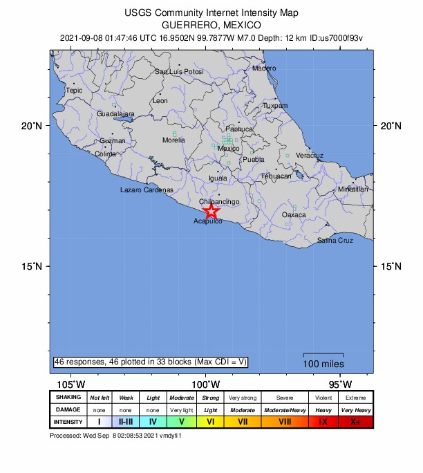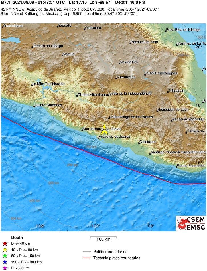 Από την πλερά του, και το Ευρωπαϊκό - Μεσογειακό Σεισμολογικό Κέντρο (EMSC) δίνει το σεισμό στα 7,1 Ρίχτερ, με εστιακό βάθος τα 40 χλμ. και επίκεντρο τα 42 χλμ. βόρεια - βορειοανατολικά του Ακαπούλκο.