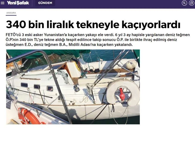 Σύμφωνα με την εφημερίδα «Γενί Σαφάκ», ένας πρώην αξιωματικός του Πολεμικού Ναυτικού, που προηγουμένως είχε καταδικαστεί ως μέλος της οργάνωσης και παρακολουθούνταν από τις τουρκικές Αρχές, αγόρασε ένα σκάφος αξίας 340 χιλιάδων τουρκικών λιρών, ως μέσο διαφυγής προς τη χώρα μας.