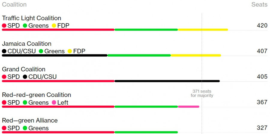 Ήδη, ο υποψήφιος των CDU/CSU Άρμιν Λάσετ κλείνει το μάτι για το ενδεχόμενο να σχηματιστεί κυβέρνηση «Τζαμάικα» (CDU/CSU, Πράσινοι, FDP), το μοναδικό σχήμα στο οποίο ο καγκελάριος θα προέρχεται από την Ένωση, ενώ ο σοσιαλδημοκράτης υποψήφιος Όλαφ Σολτς μιλά για κυβέρνηση «φανάρι» (SPD, Πράσινοι, FDP).