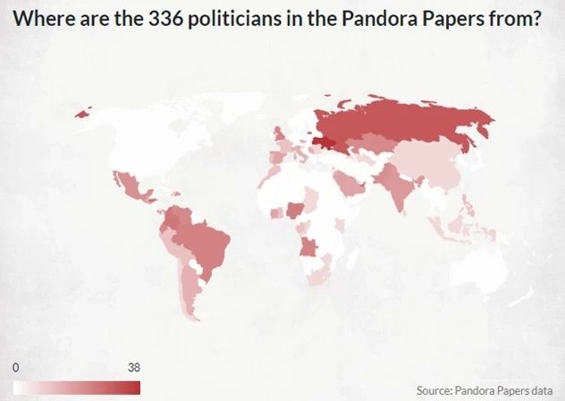 Σύμφωνα με τα πρώτα στοιχεία που έρχονται στη δημοσιότητα, στη λίστα με τα ονόματα των Pandora Papers δεν υπάρχει Έλληνας πολιτικός, για αυτό και στον χάρτη που δείχνει τη διασπορά των ονομάτων των πολιτικών ανά χώρα, η Ελλάδα έχει χρωματιστεί λευκή.