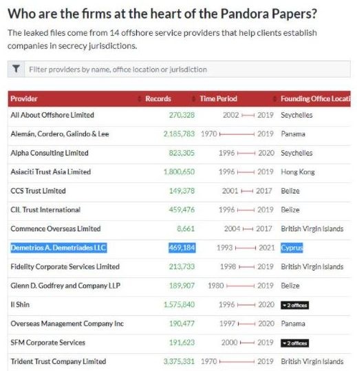 Μεγάλο μέρος της διαρροής, ήτοι 470.000 αρχεία από το 1993 έως το 2021 έχουν προέλθει από το κυπριακό δικηγορικό γραφείο Demetrios A. Demetriades LLC, γνωστό ως DADLAW.