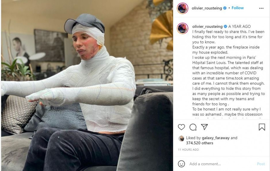 Ο διάσημος Γάλλος σχεδιαστής μόδας Ολιβιέ Ρουστέν αποκάλυψε ότι τραυματίστηκε μετά από ένα ατύχημα που είχε πέρυσι στο σπίτι του και δημοσίευσε μια φωτογραφία του με βαριούς επιδέσμους.