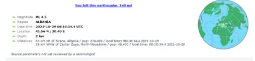 Σύμφωνα με το Ευρωμεσογειακό Ινστιτούτο, η δόνηση σημειώθηκε 58 χλμ βορειοανατολικά από τα Τίρανα και το εστιακό βάθος υπολογίζεται στα 10 χλμ.