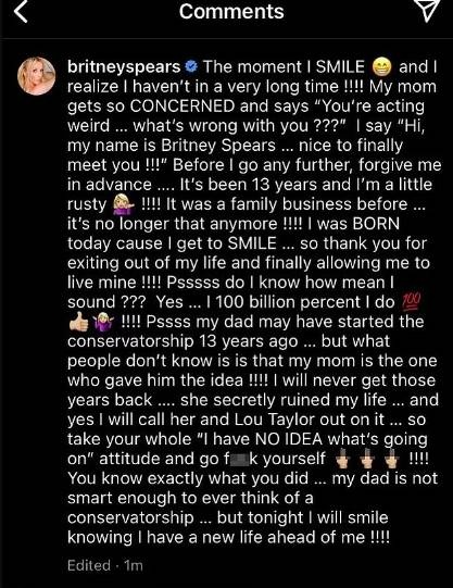 Σε μια ανάρτηση που στη συνέχεια διέγραψε, η Μπρίτνεϊ Σπίαρς κατηγόρησε τη μητέρα της ως υπεύθυνη για την ιδέα της ασφυκτικής κηδεμονίας που υλοποίησε επί 13 χρόνια ο πατέρας της. Με μια λεζάντα που έγραφε «το πιο επικίνδυνο ζώο στον κόσμο είναι μια γυναίκα με σιωπηλό χαμόγελο», η ποπ σταρ έβαλε στο στόχαστρο τους γονείς της γράφοντας πως «ίσως ήταν ο πατέρας μου που ξεκίνησε την κηδεμονία πριν από 13 χρόνια... Όμως, αυτό που ο κόσμος δεν ξέρει είναι πως η μητέρα μου ήταν αυτή που του έδωσε την ιδέα». «Δεν θα πάρω ποτέ πίσω αυτά τα χρόνια» έγραψε η Μπρίτνεϊ Σπίαρς.