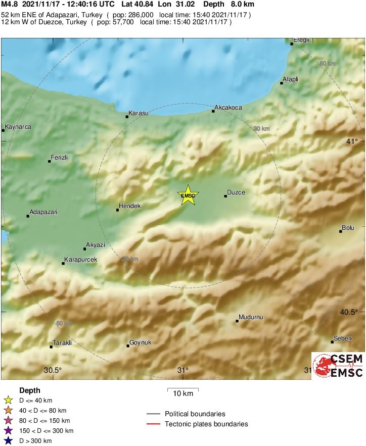 Το επίκεντρο του σεισμού εντοπίζεται 10 χιλιόμετρα δυτικά της πόλης Ντούτζε, σχεδόν 200 χιλιόμετρα ανατολικά της Κωνσταντινούπολης. Μέχρι στιγμής δεν έχουν αναφερθεί θύματα ή ζημιές.