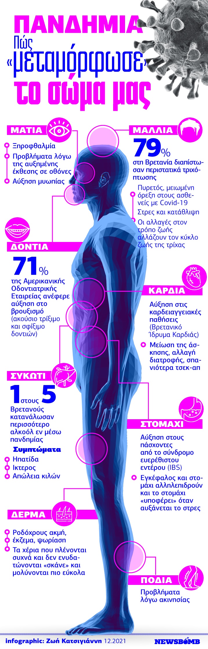 Η πανδημία «έφερε» μαζί της αλλαγές ακόμη και για εκείνους που δεν νόσησαν, προκαλώντας μεγάλες αλλαγές στο σώμα μας, από την απώλεια μαλλιών, μέχρι μία σειρά από «σκαμπανεβάσματα» στα κιλά μας, αλλά και πιο σοβαρά προβλήματα υγείας γράφει ο Guardian. Τι άλλα «σημάδια» άφησε η εποχή του κορονοϊού στο σώμα μας;